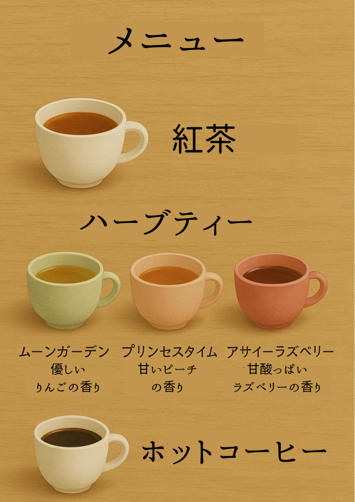 ご来店のお客様には、紅茶・ハーブティー・ホットコーヒーなどをご用意しております